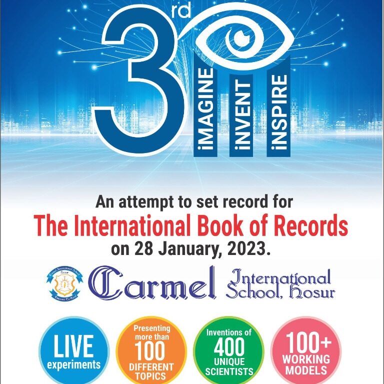Greetings from Carmel! We are proud to announce that our school is going to attempt another record with “THE INTERNATIONAL BOOK OF RECORDS” for our event – The Third ‘i’ (iMAGINE, iNVENT, iNSPIRE) consists of 👉 Live experiments 👉 Presentation on 100 different topics …